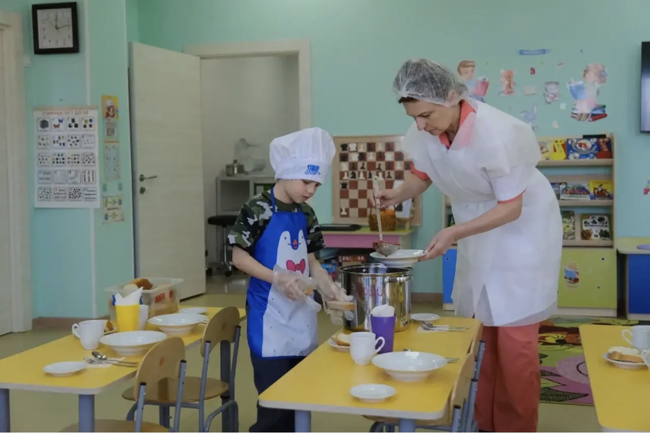 Родители отметили, что в группах создана благоприятная эмоциональная обстановка во время приема пищи. Дети обеспечены соответствующей посудой, столы и стулья соответствуют ростовым показателям. Воспитатель и помощник воспитателя создают благоприятную атмосферу во время приема пищи детьми: следят за осанкой и поведением за столом, сообщают названия блюд, обращают внимание на вкусно приготовленную пищу, осуществляют индивидуальный подход. Дети приучены пользоваться салфетками, столовыми приборами, благодарят после еды. Родители отметили, что организация питания в детском саду на высоком уровне.