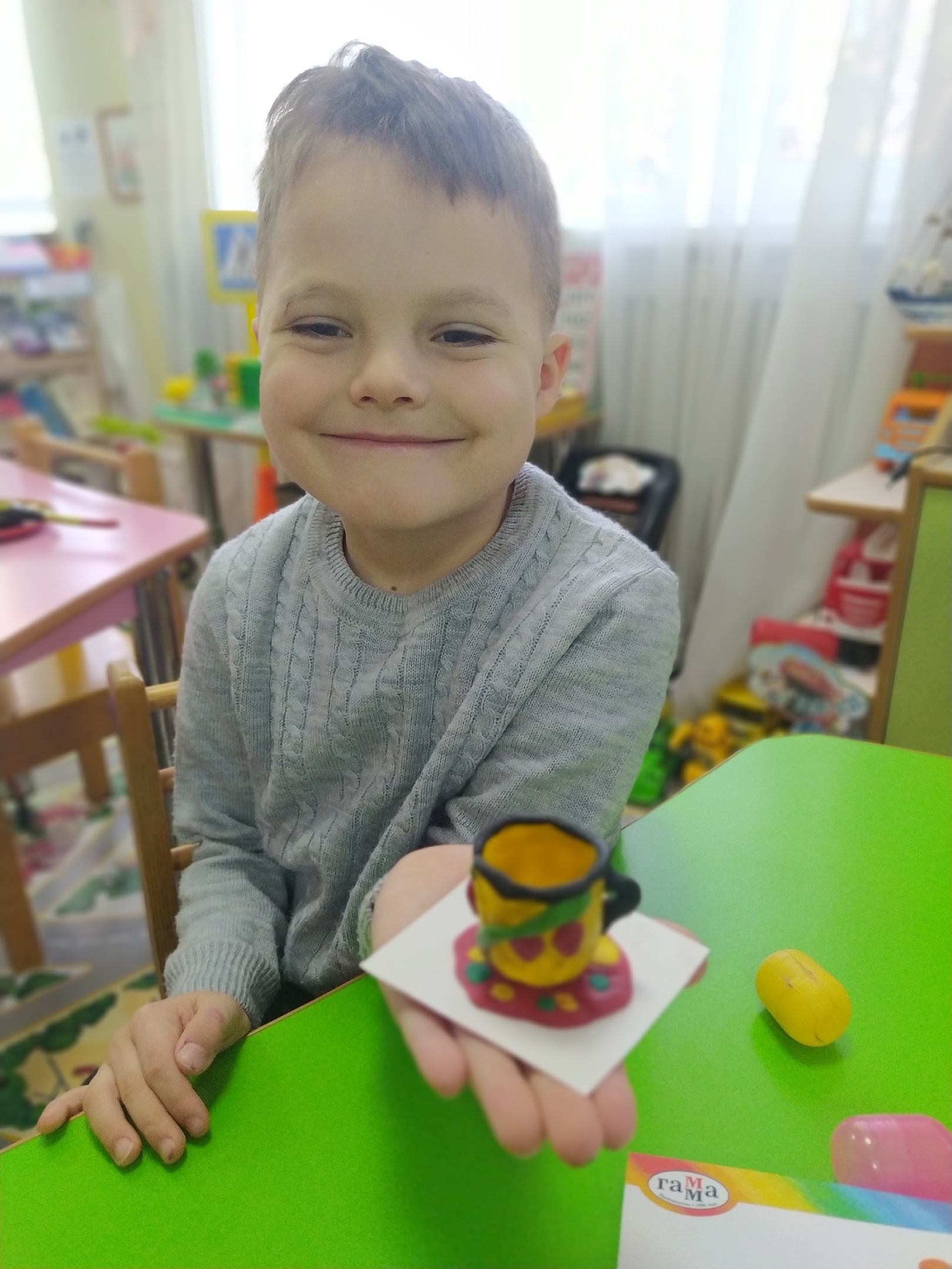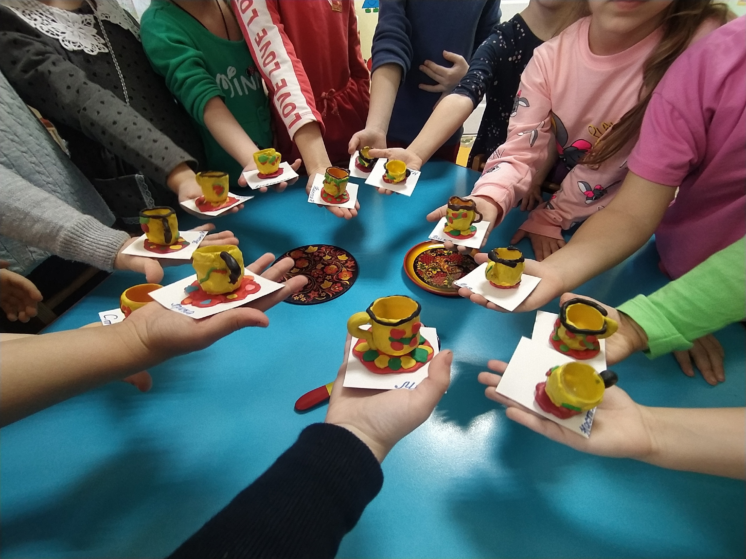 На занятиях по художественно – эстетическому развитию расписывали шаблоны посуды под "гжель", использовали контейнеры от киндер-сюрпризов для создания чайной пары- чашки и блюдца, украсив их пластилином под "золотую хохлому". Таким образом, мы с ребятами увлекательно и полезно провели эту тематическую неделю!