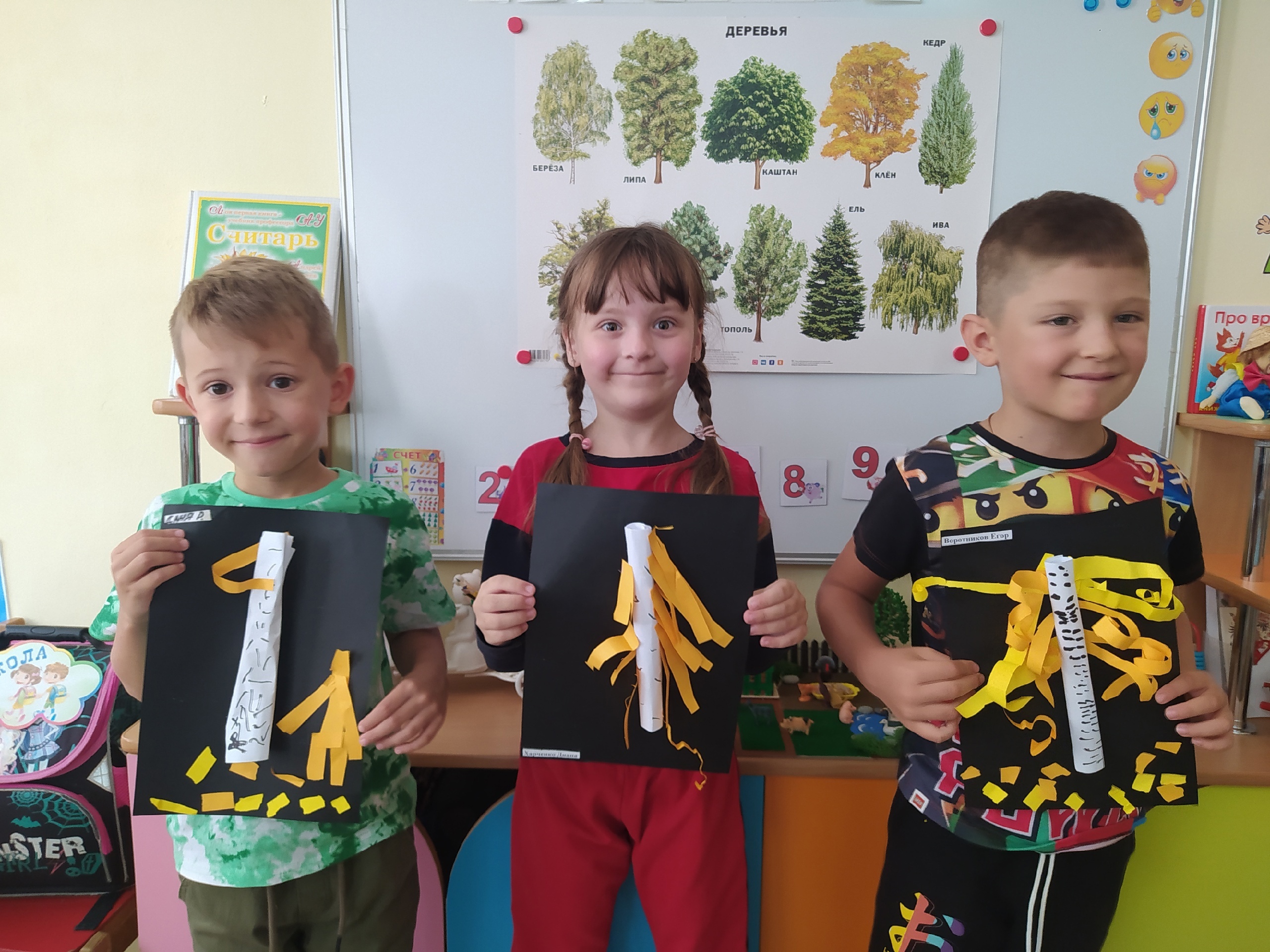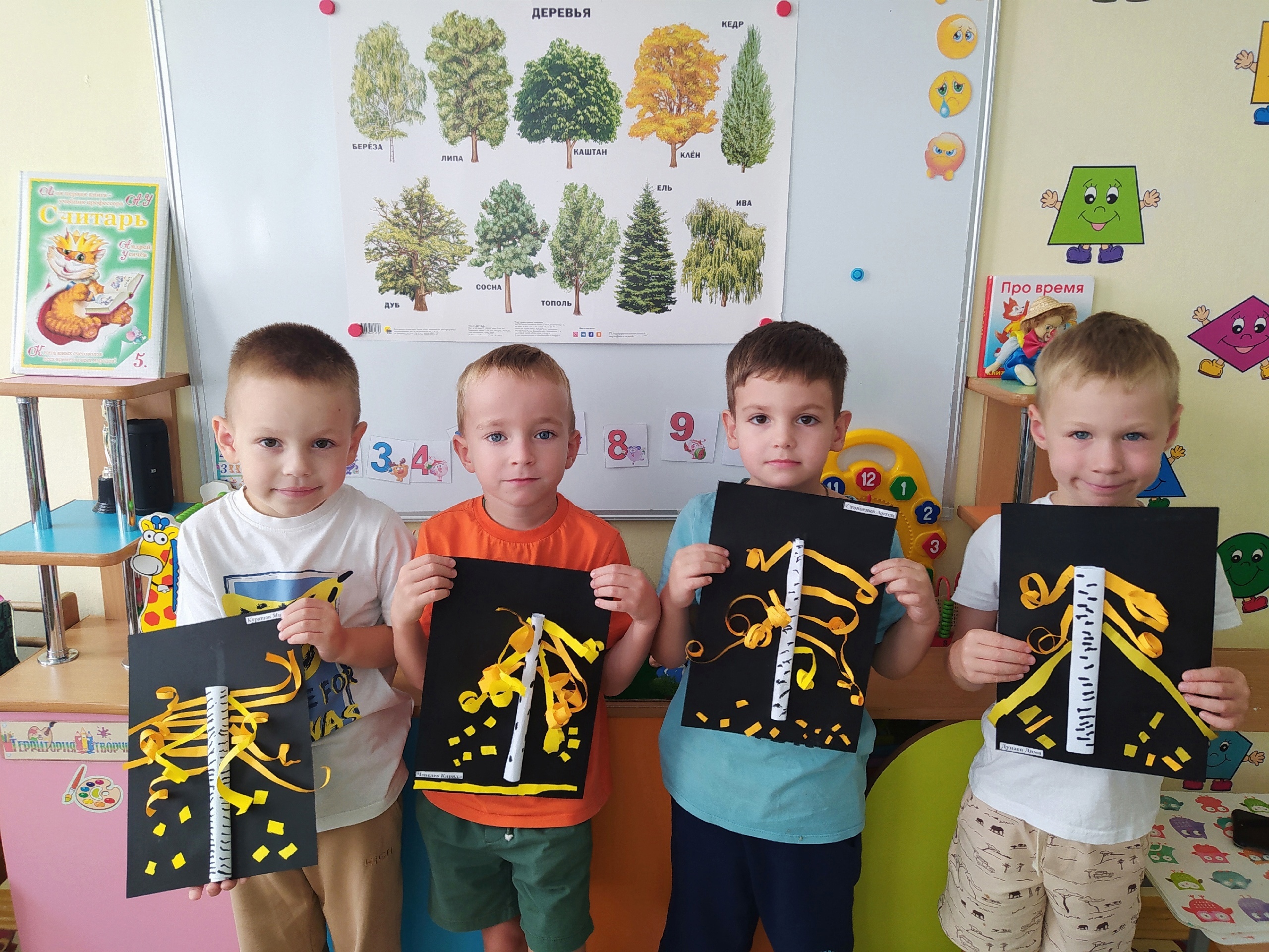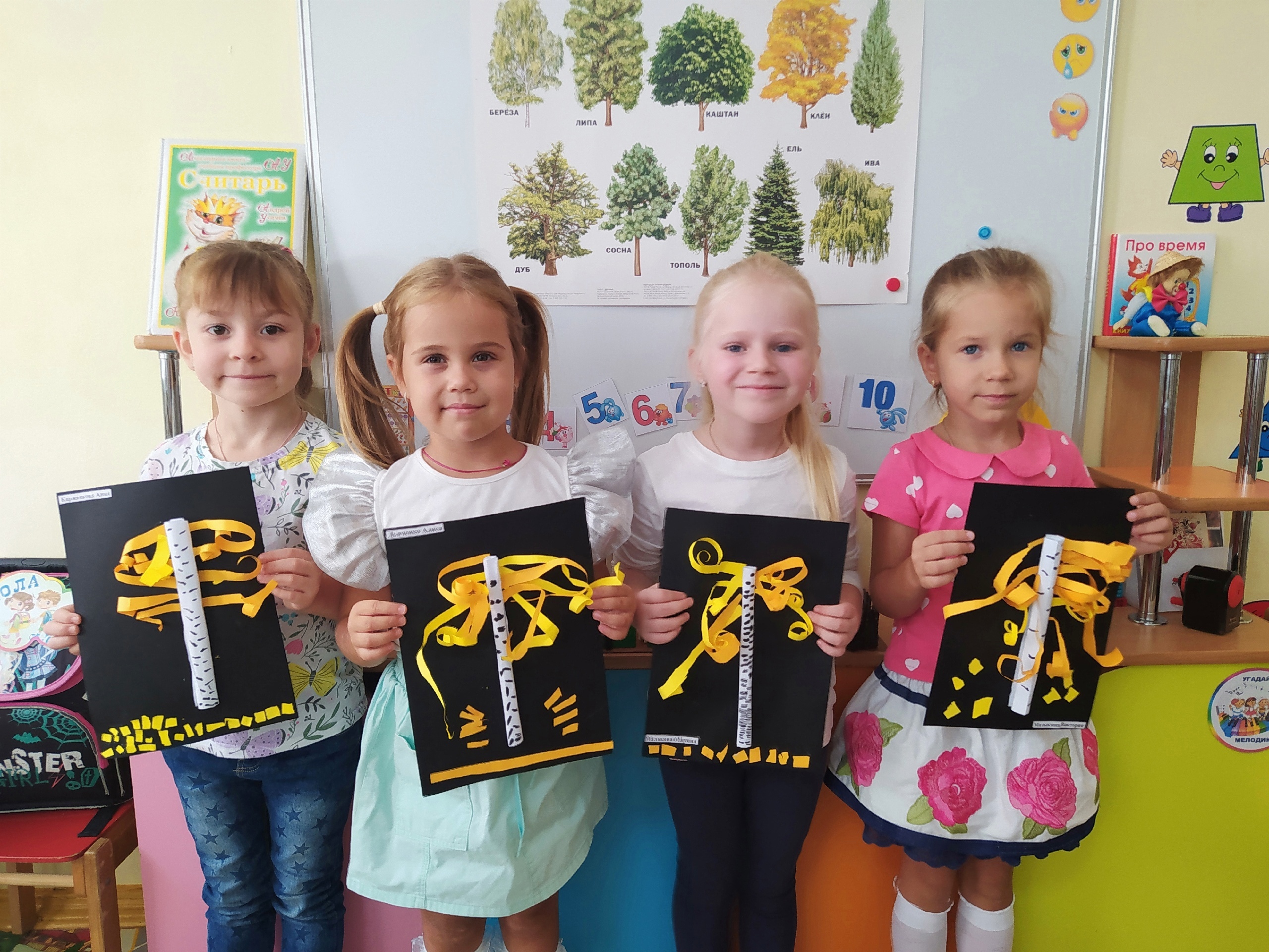 Ребята группы "Смешарики" выполнили аппликацию "Осенние березки".