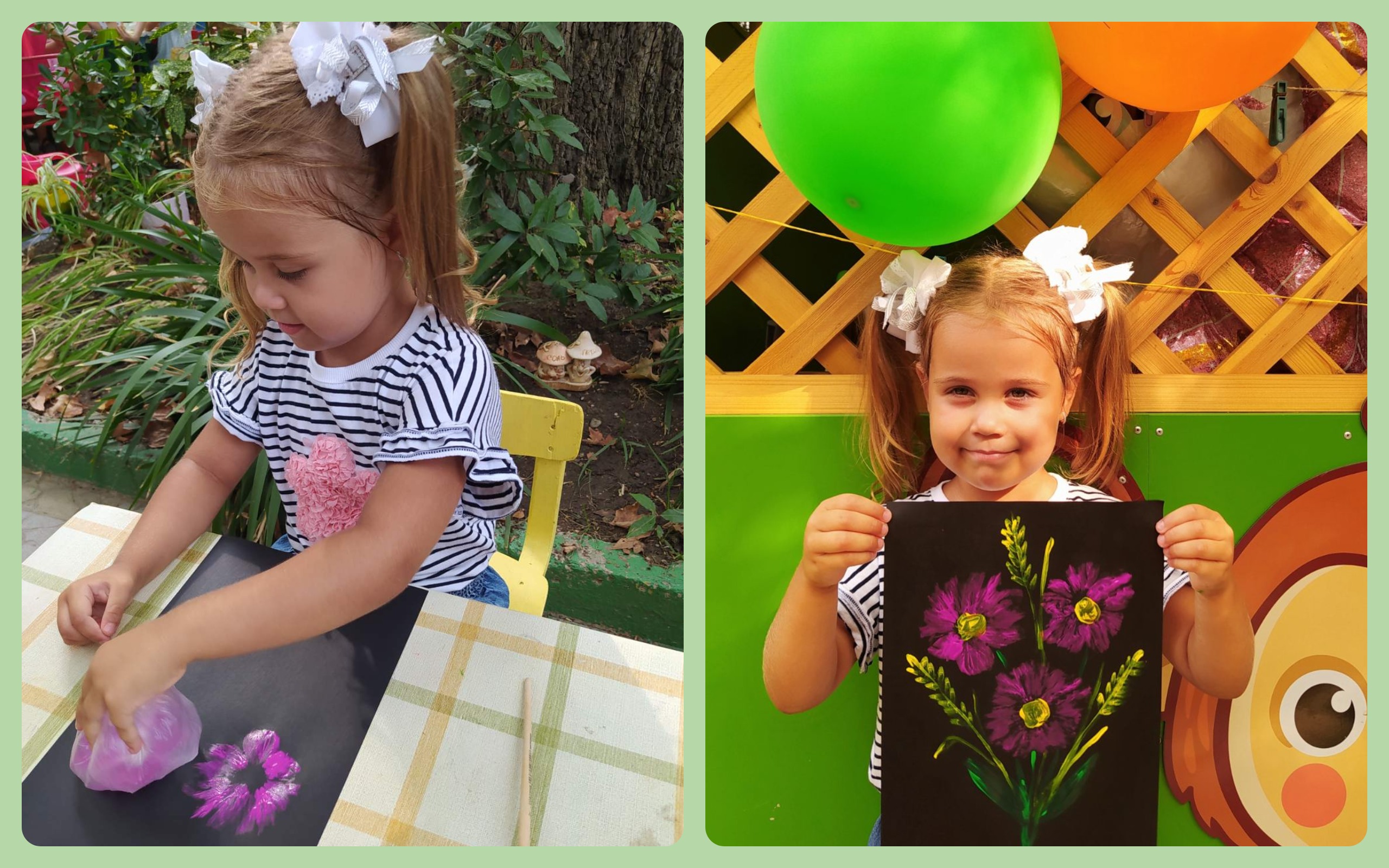 Сегодня в День знаний ребята старшей группы "Смешарики" познакомились с необычной техникой рисования: рисование с помощью целлофанового пакета "Осенний букет".